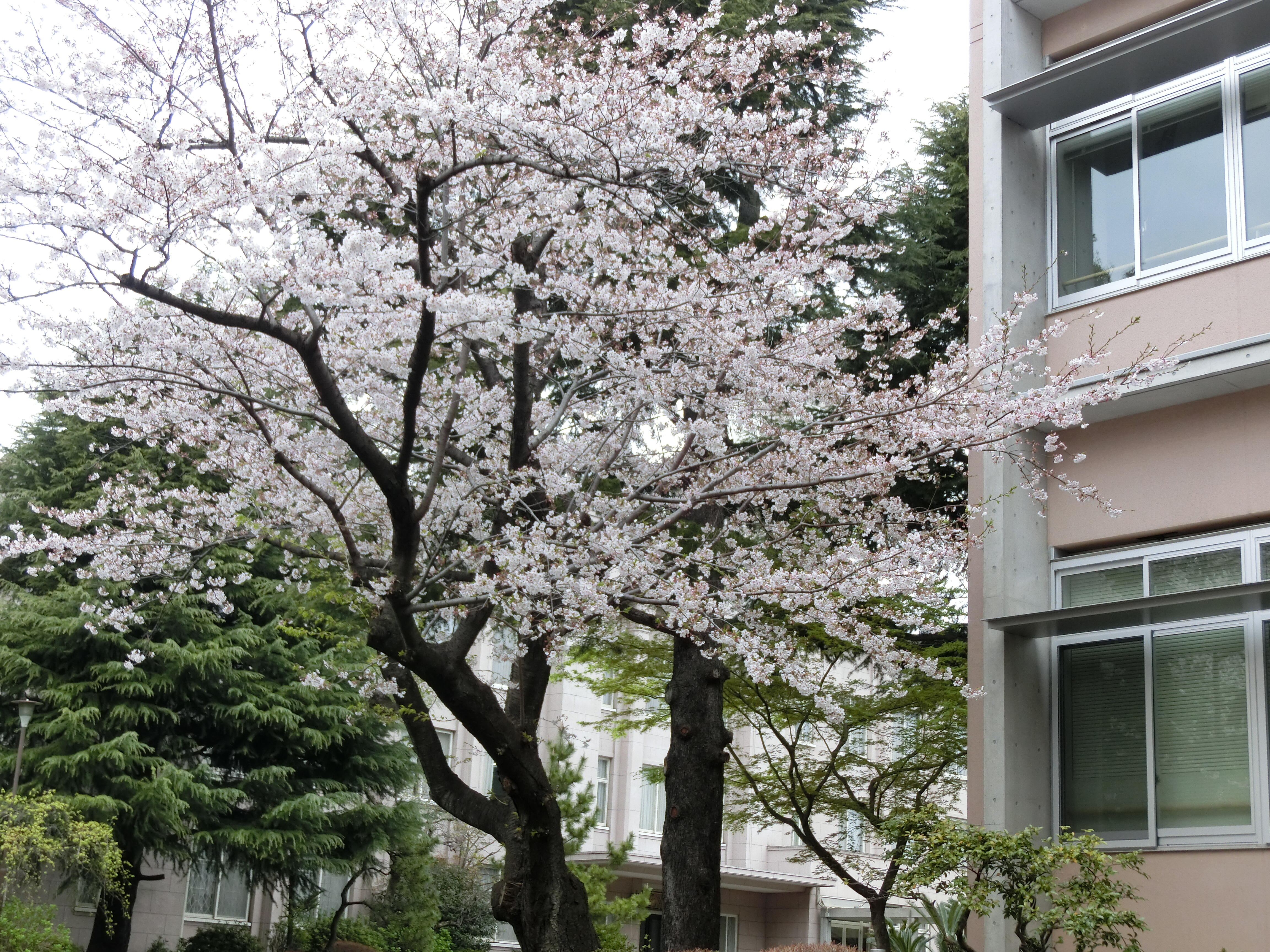 この細い桜はソフィア・バラホールのわきに今年植えた桜です。ほんの少しだけ花が咲きました。これから大きくなることでしょう。