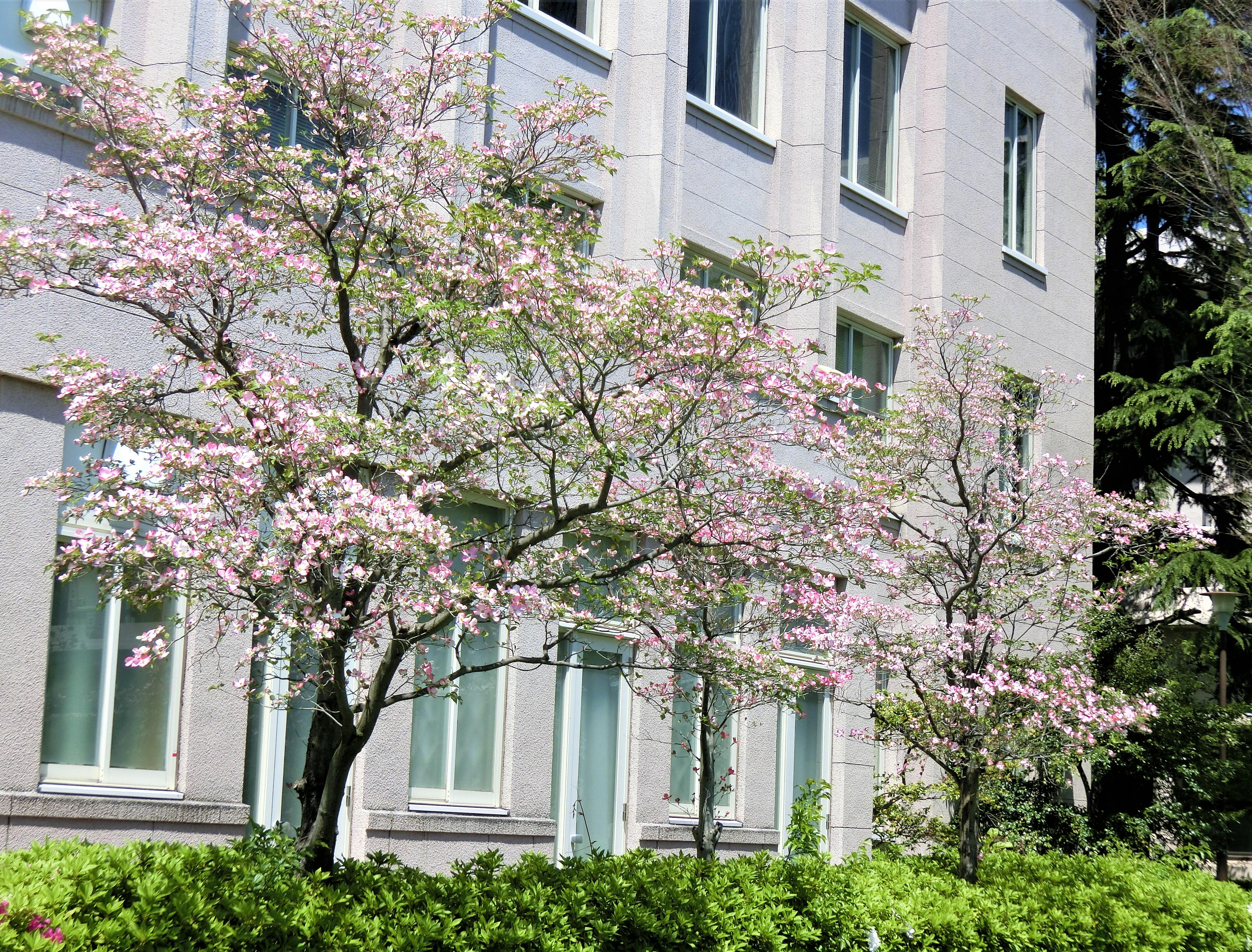 前庭はメタセコイアに続いてケヤキもだんだんと勢いづいてきています。モッコウバラはマリア様を飾っています。ハナミズキはちょうど満開です。