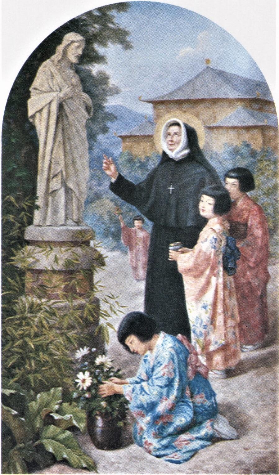 創立者の祝日には毎年創立者の絵姿のカードを渡しています。上の画像は今年度初等科生に渡したカードです。小林聖心に原画があります。Ferroniと言う画家が、日本から送られてきた絵をもとに描いたものと言われています。画家本人は日本を訪れたことはないようで、着物姿の子どもたちも背景の建物もどこか異国風です。しかし、同じイエスのみこころを学び、大切にする心が表されています。東京の聖心には、この絵と対になると考えられる作品が初等科の講堂に飾られています。そちらには、聖マグダレナ・ソフィアの傍らに初聖体の式に与ると思われる白い服を装った一人の少女が描かれています。多様な文化の中で、イエスのみこころで一つになる、聖心のあり方を示すもの絵です。