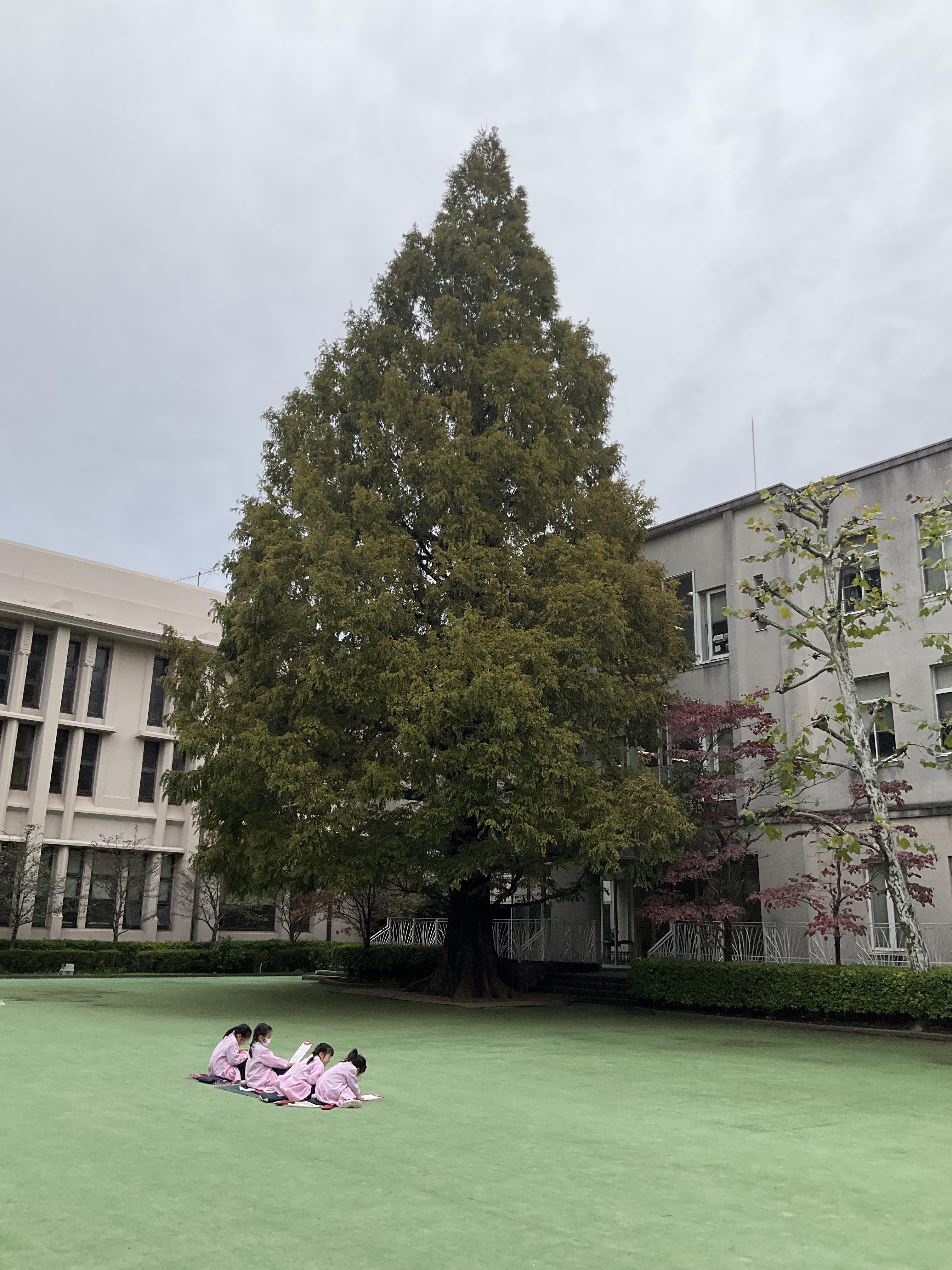 前庭でお絵描きをしているのが見えたので、何を描いているのか見に行きました。1年生が4月にブログでご紹介した「わたしの木」の秋の様子を描いているところでした。最近の冷え込みでハナミズキは紅葉し、赤と茶色のクーピーを上手に混ぜて描いている子どももいました。一番人気のメタセコイアは葉っぱの先に黄色が入ってきていて「この後何色になると思う?」「黄色!」「どうかしら。楽しみにしていてね。冬はどうなると思う?」「葉っぱがなくなる!」描いている紙をよく見ると「わたしの木」の名前が書いてありました。名前をつけているとは知りませんでした。名前をつけると、木はただの木ではなく、お友達のひとりになっているのでしょう。「わたしの木」に会いに来る卒業生がいるのも納得です。