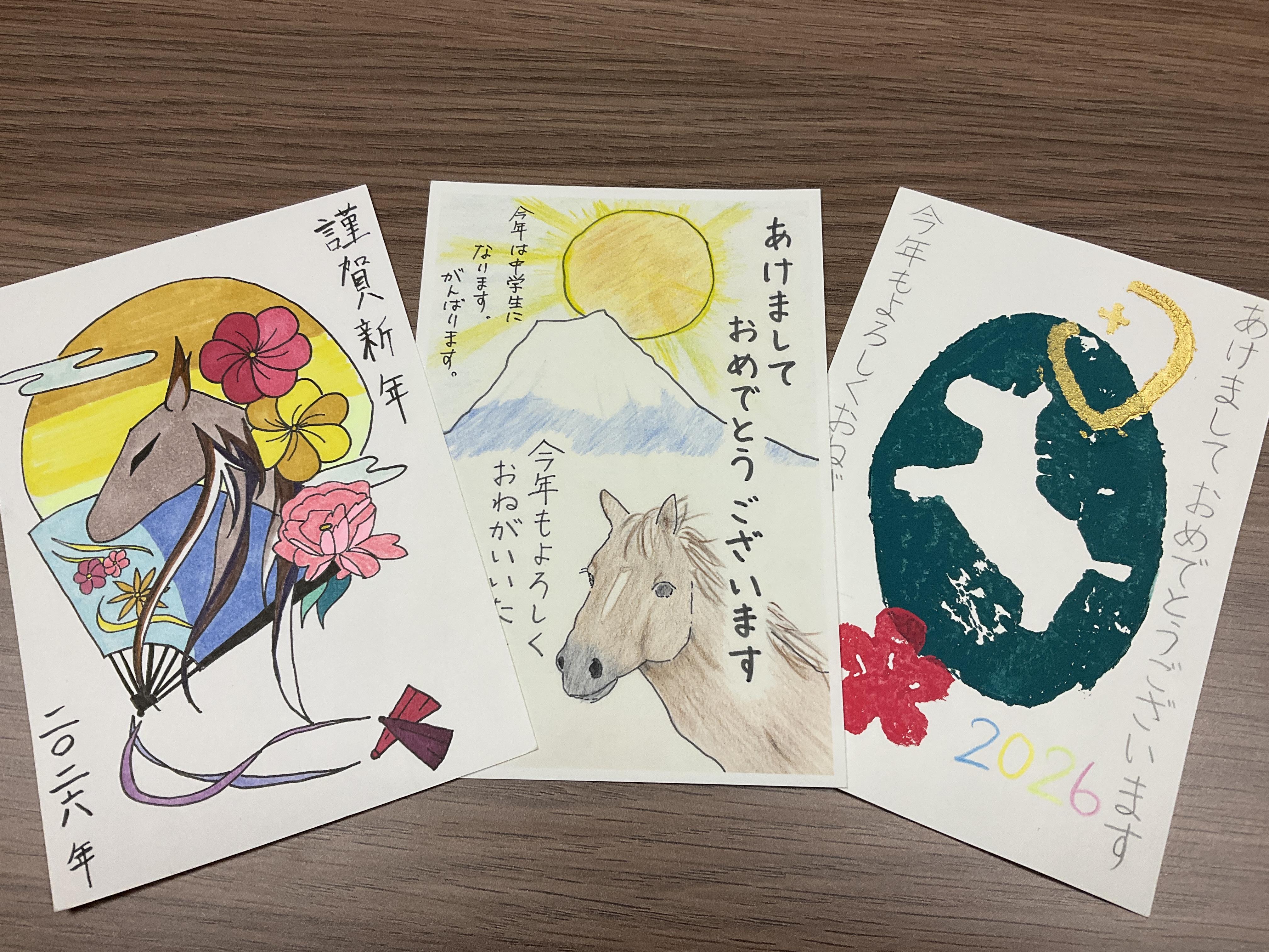 4月に着任して初めてのクリスマスと新年。子どもたちからたくさんのクリスマスカードと年賀状をいただきました。手作りのカードや版画の年賀状。それぞれ工夫があり、一枚一枚、うれしく読みました。ラメを使ったツリー、白いボタンの雪だるま、干支の馬もさまざまで、どれも個性的。色使いや配置を工夫しているもの、イラストと文章のバランスがよく読みやすいもの。また今年の目標が書いてあったり、読む人、つまり校長のことを思いやった温かい言葉を選んでくださった方もあり、子どもたちの表現する力、伝える力に圧倒されました。