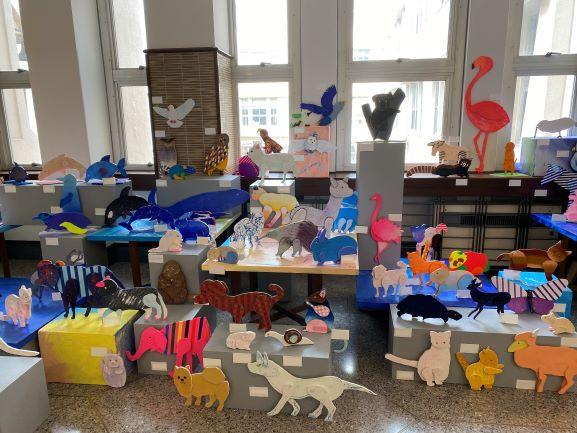 初等科の集大成として木工作に取り組みました。テーマは「私みたいな動物」。自分との共通点を探しながら動物を決めました。厚みのあるベニヤ板は電動式糸鋸で切断するのが大変です。昨年までの経験を生かし、お友だちと協力して進めました。着彩は、アクションペインティングやスパッタリング、ドロッピングなど、様々な技法を駆使し、自分のイメージに近づけました。