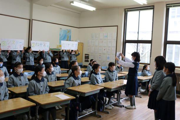 3年生は聖心クイズです。クラスで問題を考え3択クイズにしていました。いつも通っている学校ですが、まだまだ知らないことがたくさんあることが分かりました。