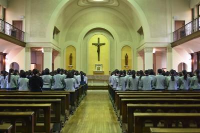 前日18日に生徒たちは学校中の大掃除を終え、通知表もそれぞれ手にしています。加えて、4月に始まる校舎改修工事の関係で、学年の教室大移動が行われました。特に10年生は高等科校舎から、中央の中等科校舎2階職員室前へ移動となり、戸惑いを隠しきれず、朝のHRも落ち着かない様子でした。それでも、聖堂に向かう時には、身だしなみを整え、切り替えて静かに移動しました。